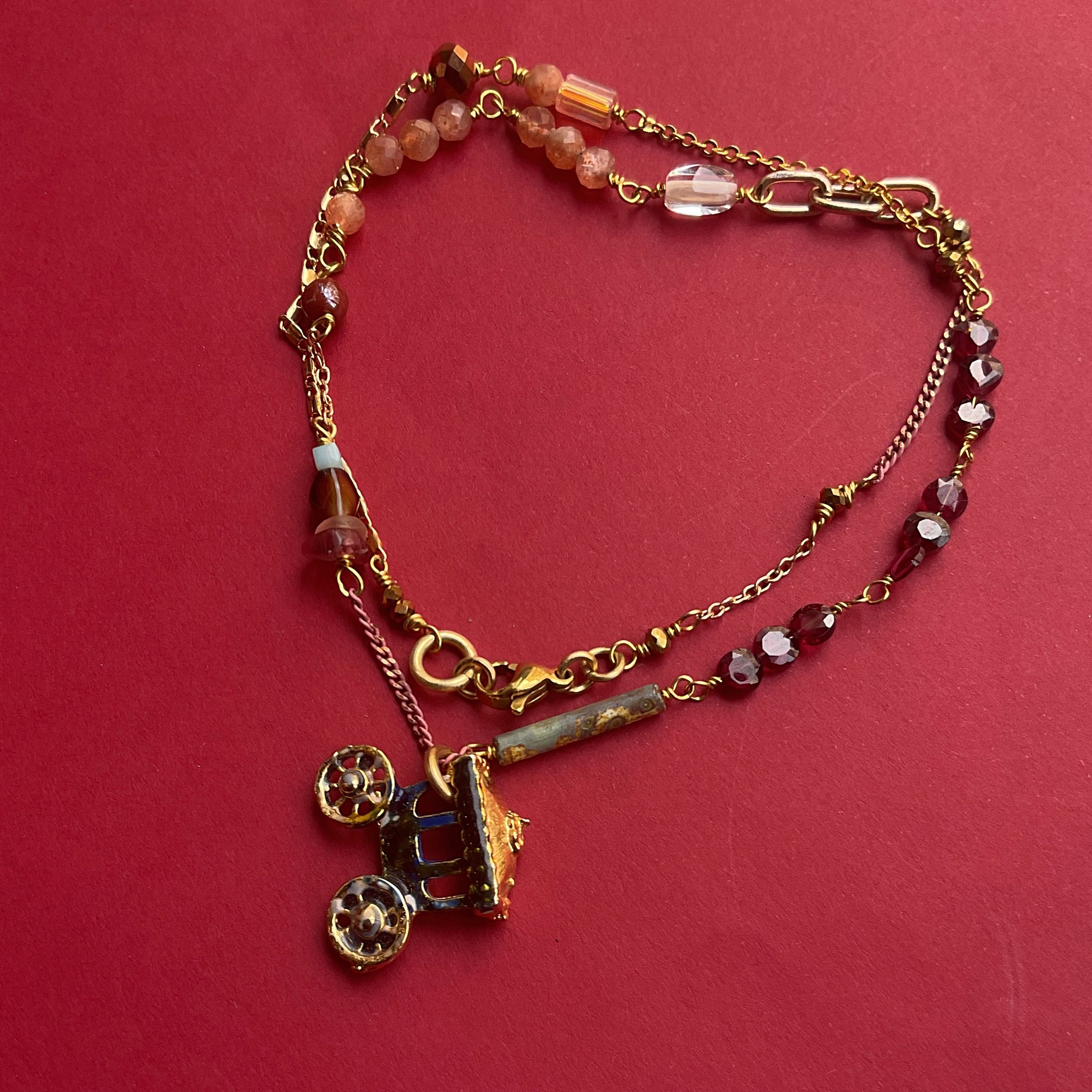 Il comprend dans sa composition un petit carosse miniature vintage et des perles récentes en grenat et rodhochrosite.