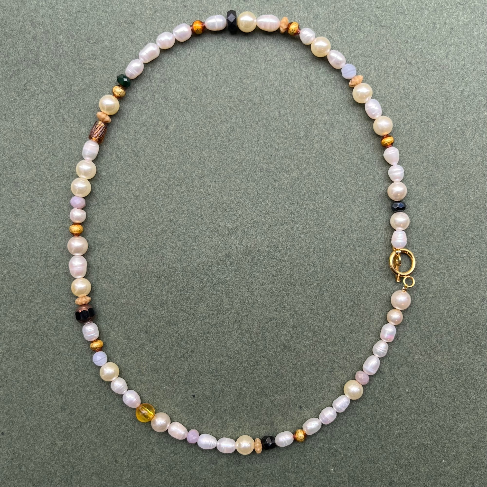 Le collier "HAÏTÉ" est une pièce unique composée avec des matériaux upcyclés, mélange de perles de culture et de perles nacrées vintage.