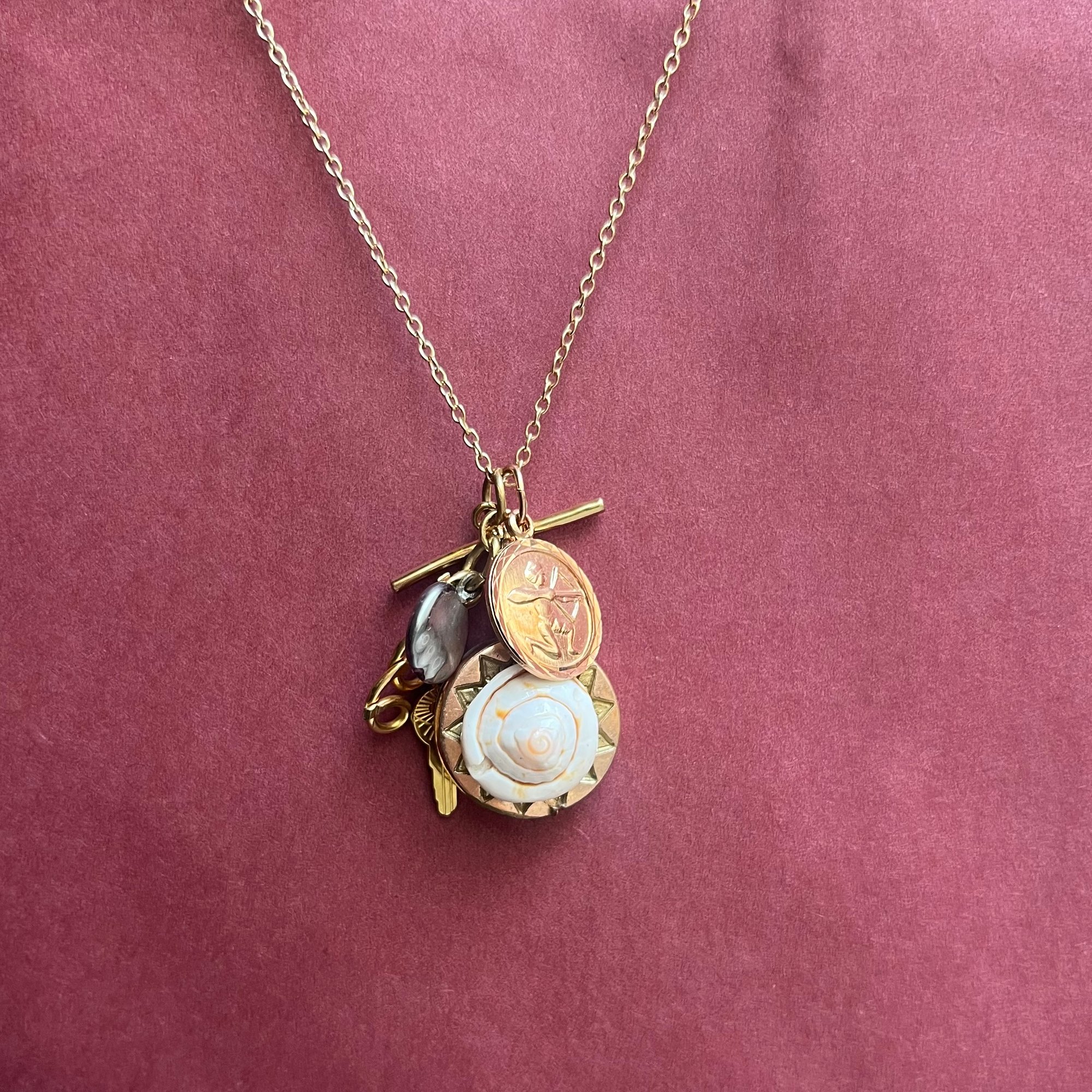 Motif central pendentif vintage orné d'un coquillage recyclé.
