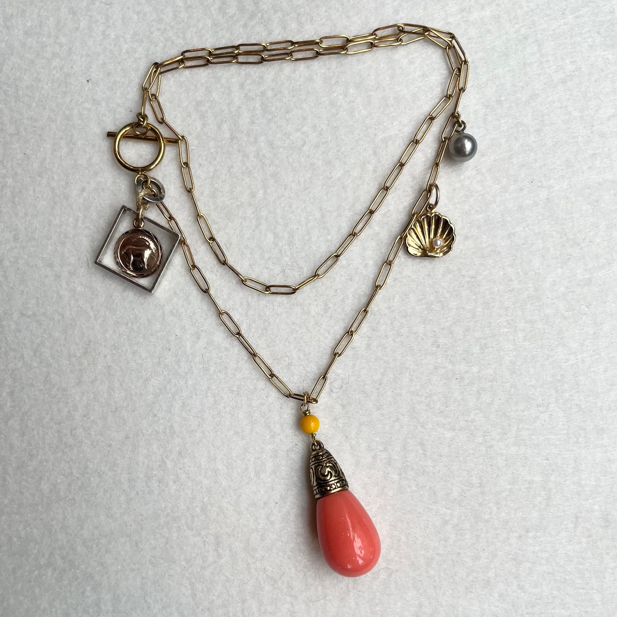 Le sautoir "Capricorne" est une pièce unique composée de matériaux upcyclés : médaille, pendentif coquille vintage et goutte en résine coloris rose saumon upcyclée.